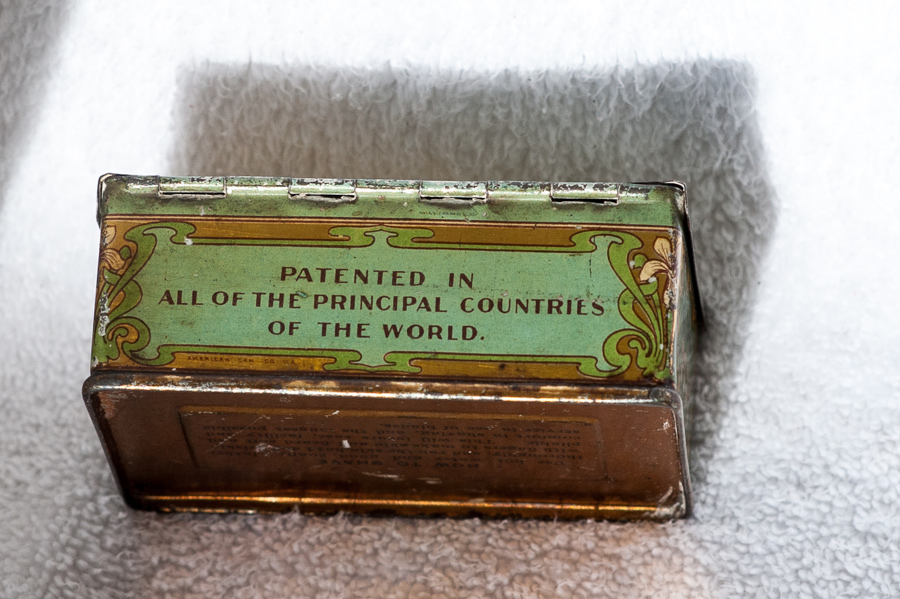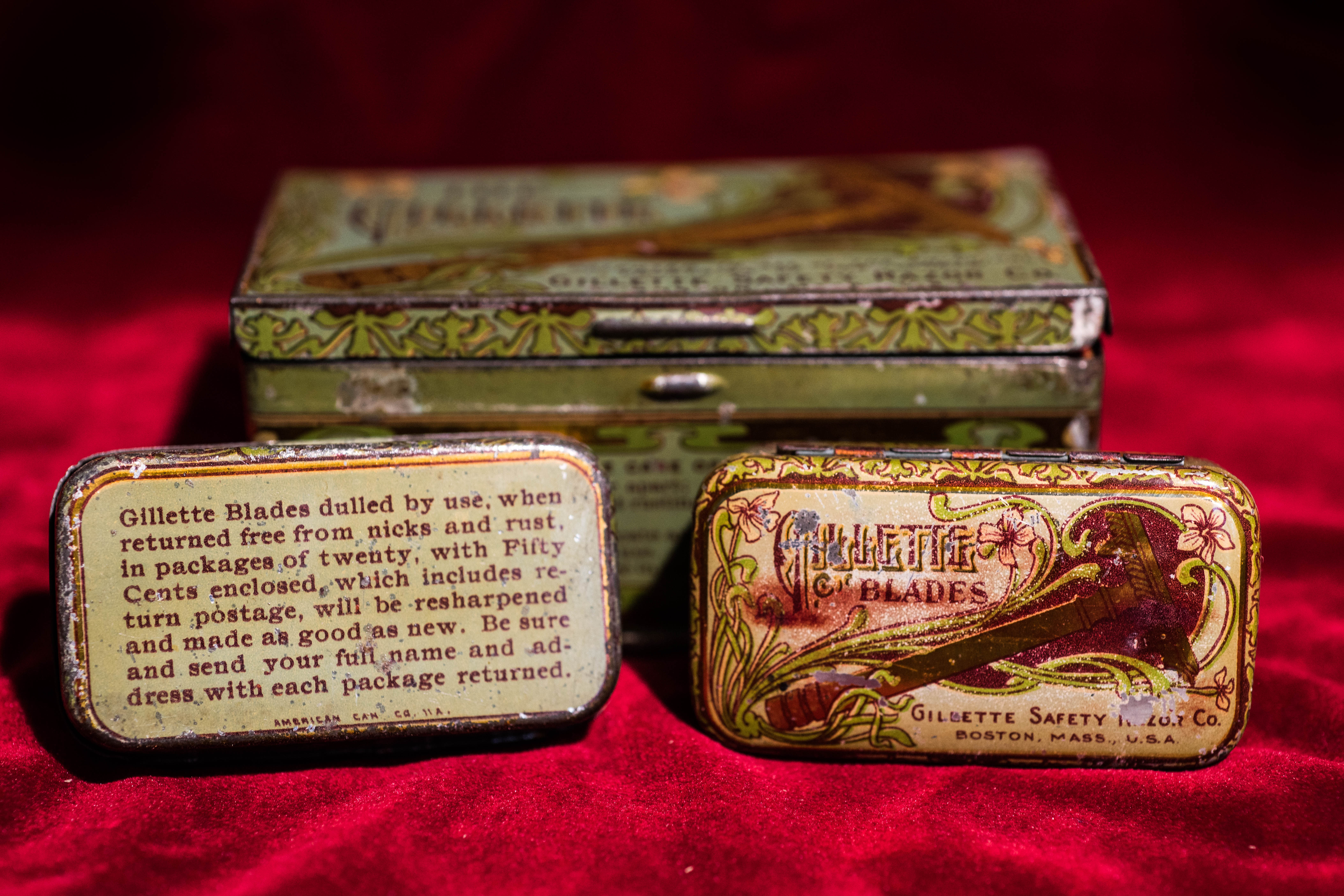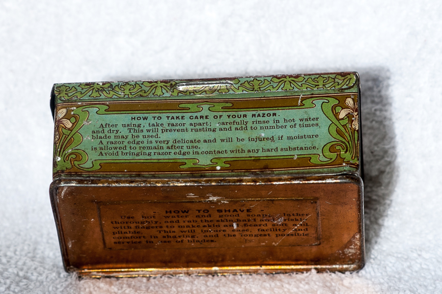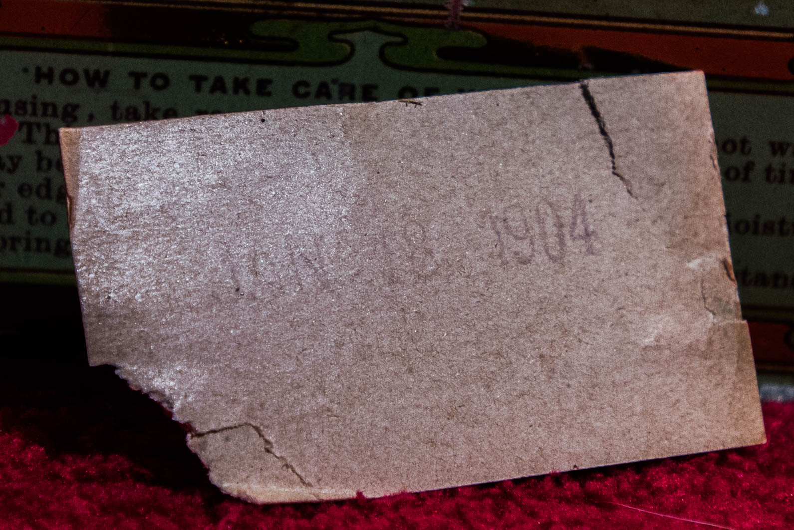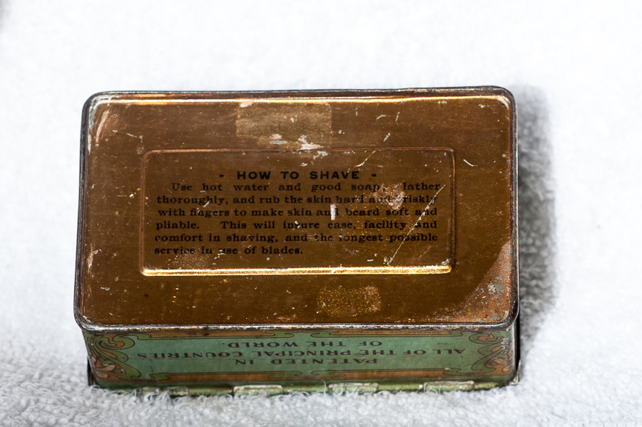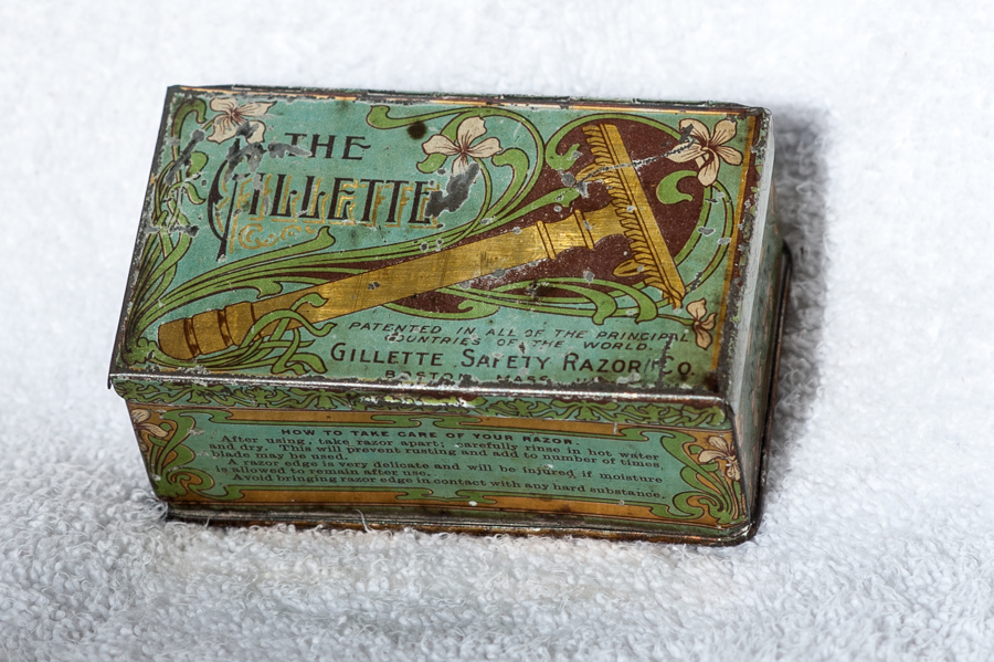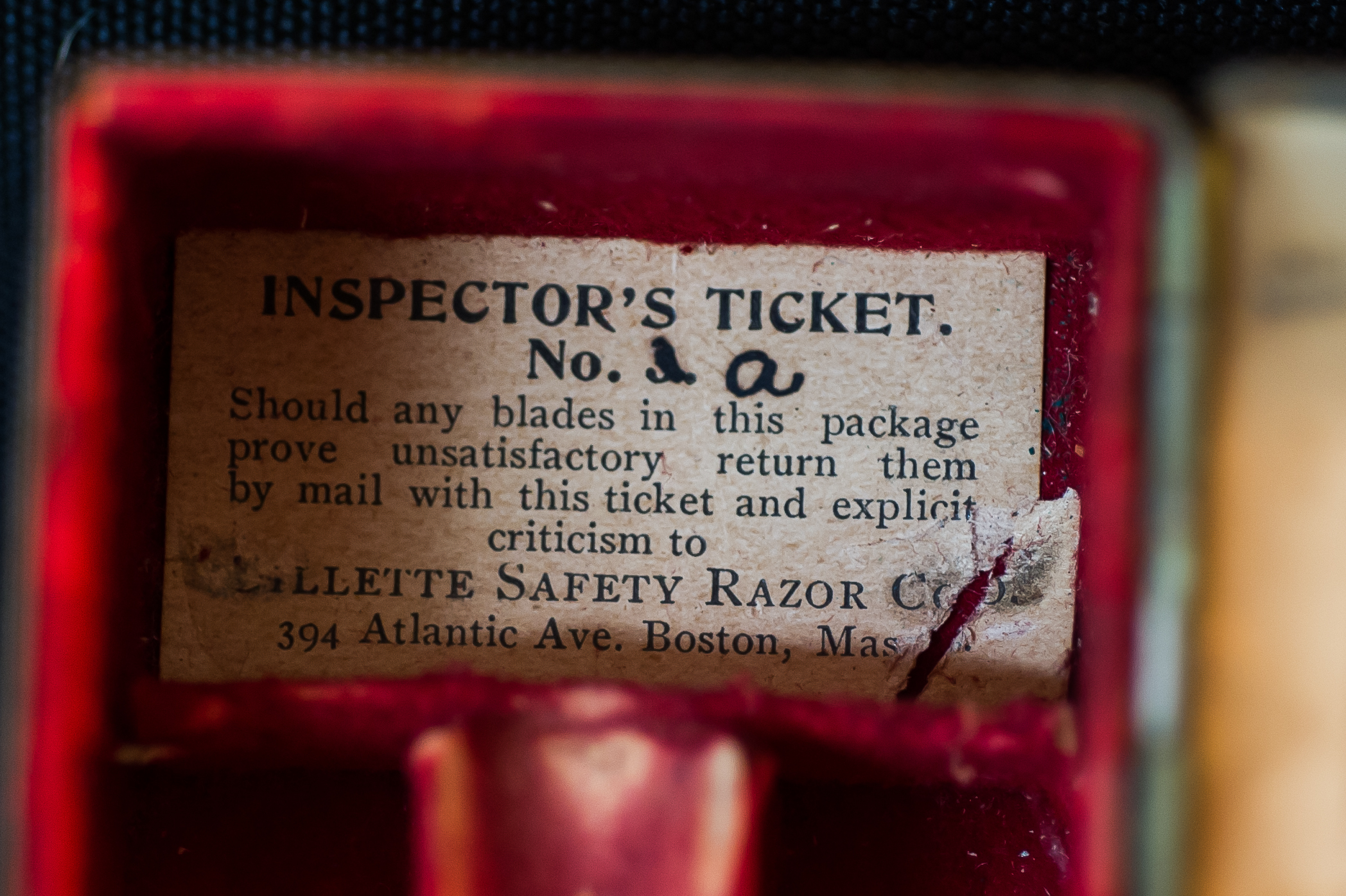 The very first production Gillette Razor Set in the lithographic tin with the tin blade holders probably manufactured 1903 inspected and packaged on January 18, 1904 for sale. Collectors later labeled the razor the Double Ring because of the two rings near the razor head. A rough estimation of the number of tins to survive is approx 20 or so. Only around 4 are known to have felt and two that have razors. The tin blade holders are even harder to find than the larger tin. Only a handful are known at this pont. This is the most complete set known at this time with the original razor and original 20 blades. The inspection ticket was undated. Gillette quickly went to a leather covered wooden case making these tins ultra rare. Many of the surviving tins were found in the Gillete factories in the 70’s. It is possible many were never finished and sold. See the Histories and Mysteries page for more theory.
