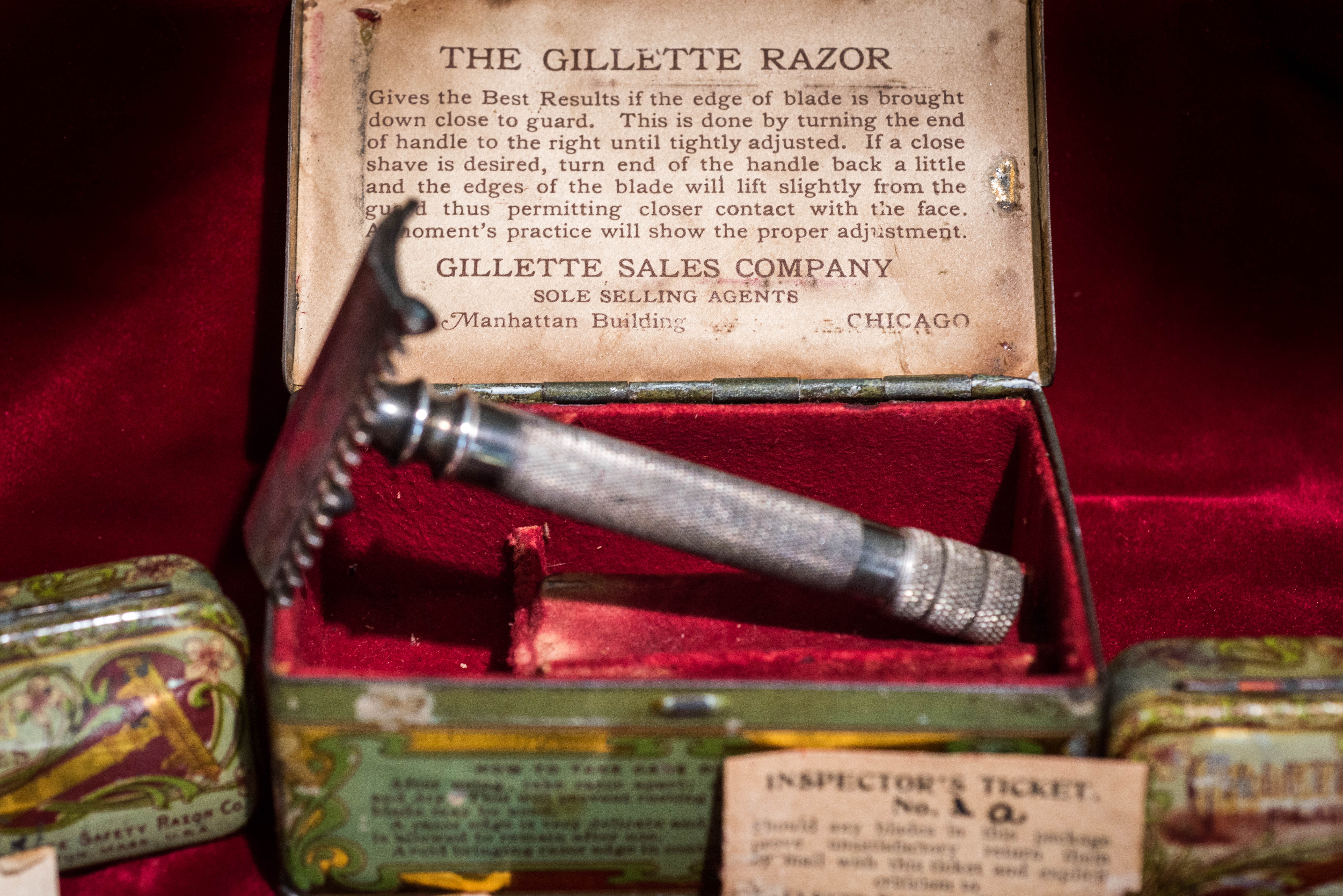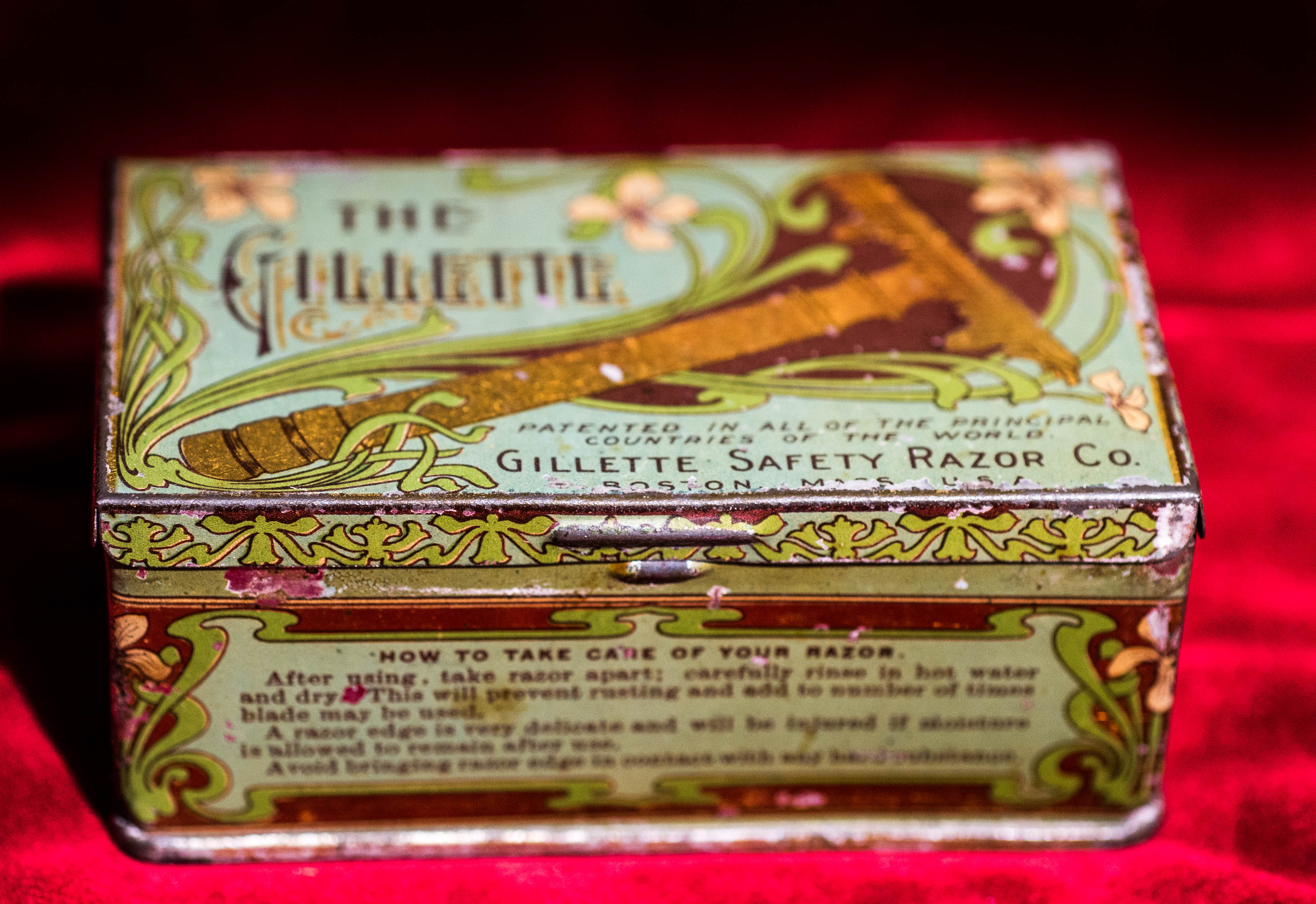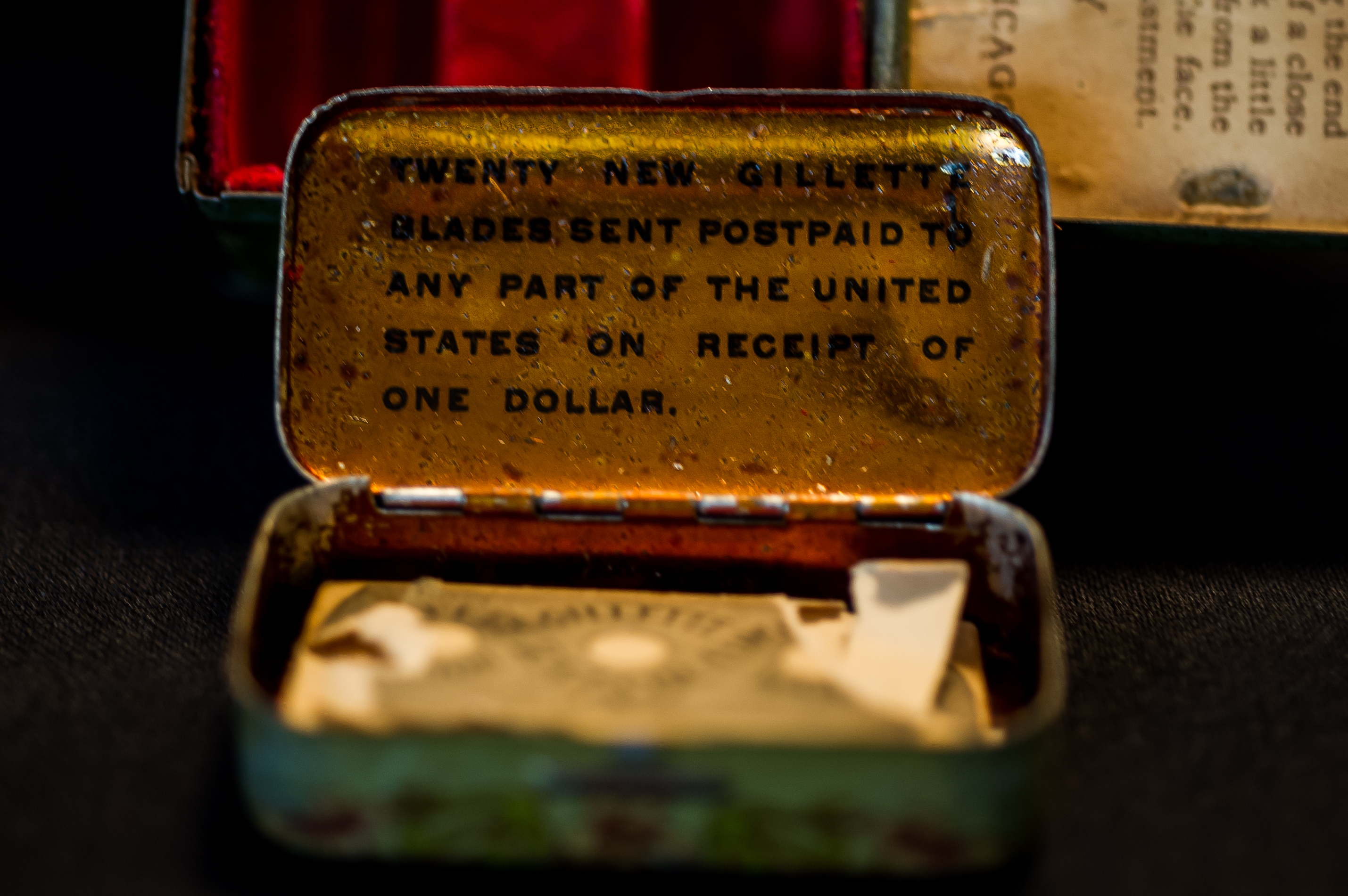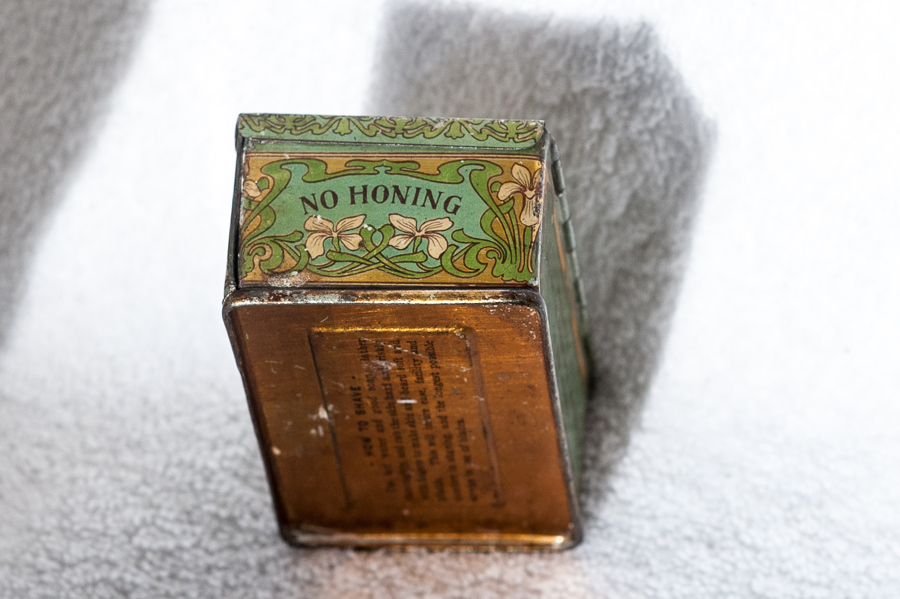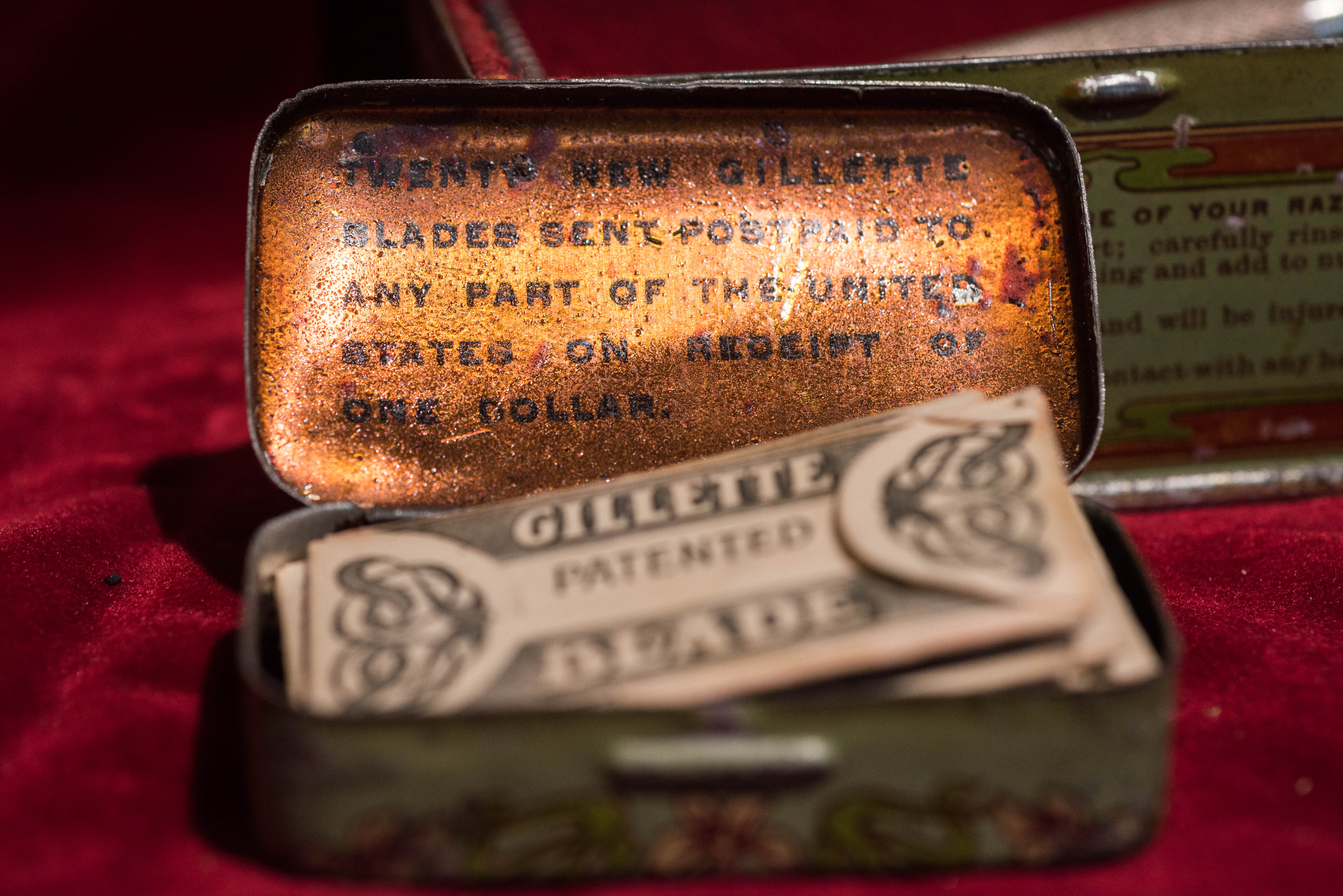 The very first production Gillette Razor Set in the lithographic tin with the tin blade holders probably manufactured 1903 inspected and packaged on January 18, 1904 for sale. Collectors later labeled the razor the Double Ring because of the two rings near the razor head. A rough estimation of the number of tins to survive is approx 20 or so. Only around 4 are known to have felt and two that have razors. The tin blade holders are even harder to find than the larger tin. Only a handful are known at this pont. This is the most complete set known at this time with the original razor and original 20 blades. The inspection ticket was undated. Gillette quickly went to a leather covered wooden case making these tins ultra rare. Many of the surviving tins were found in the Gillete factories in the 70’s. It is possible many were never finished and sold. See the Histories and Mysteries page for more theory.